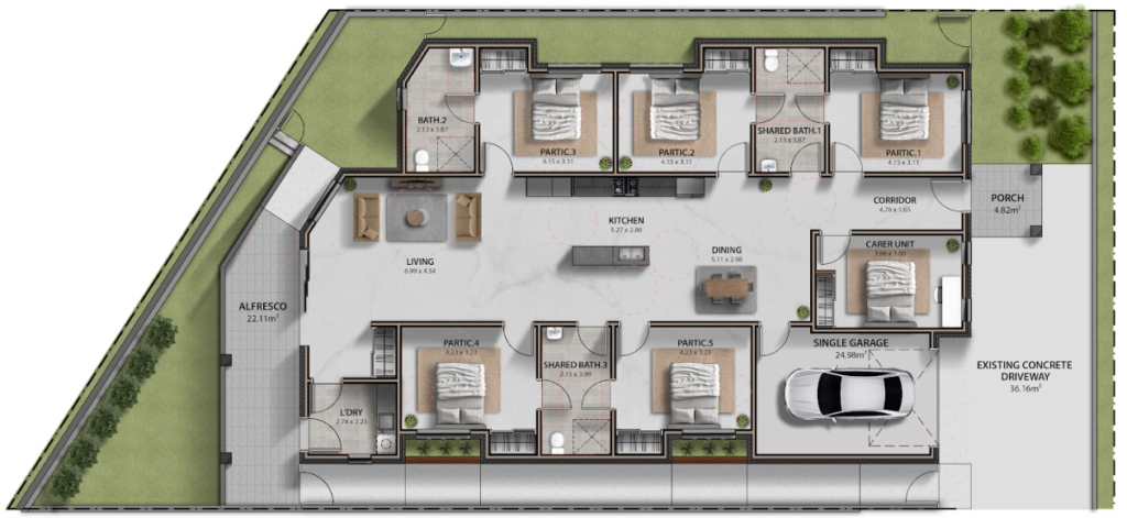 We’ve incorporated elements that promote independence and choice, such as personalized bedrooms with ample storage and adaptable features, while also ensuring communal spaces are welcoming and inviting. The design focuses on creating a space that fosters a sense of community and belonging. We belive a well-designed environment can have a profound impact on well-being and we’re dedicated to creating spaces that support individuals with NDIS funding in living their best lives.